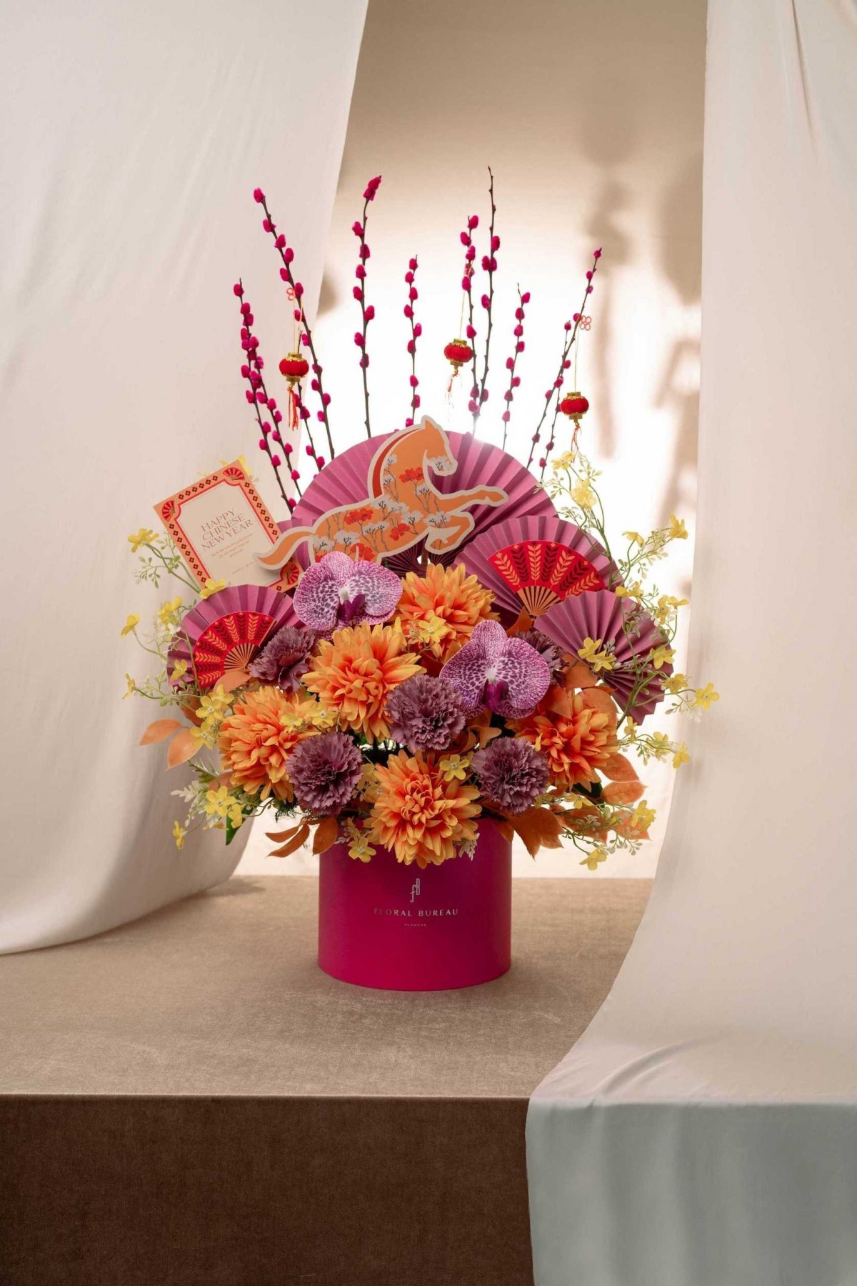 Citrine is designed for presence — warm golden tones, deep plums, and rich sunset colours arranged in a tall, modern silhouette. The structure is sleek, layered, and confident, making it an instant focal point in any room. Fully artificial, Citrine keeps its shape and vibrance throughout the season, offering a bold but polished take on Lunar New Year décor. It’s the piece you choose when you want something striking without feeling overdone.