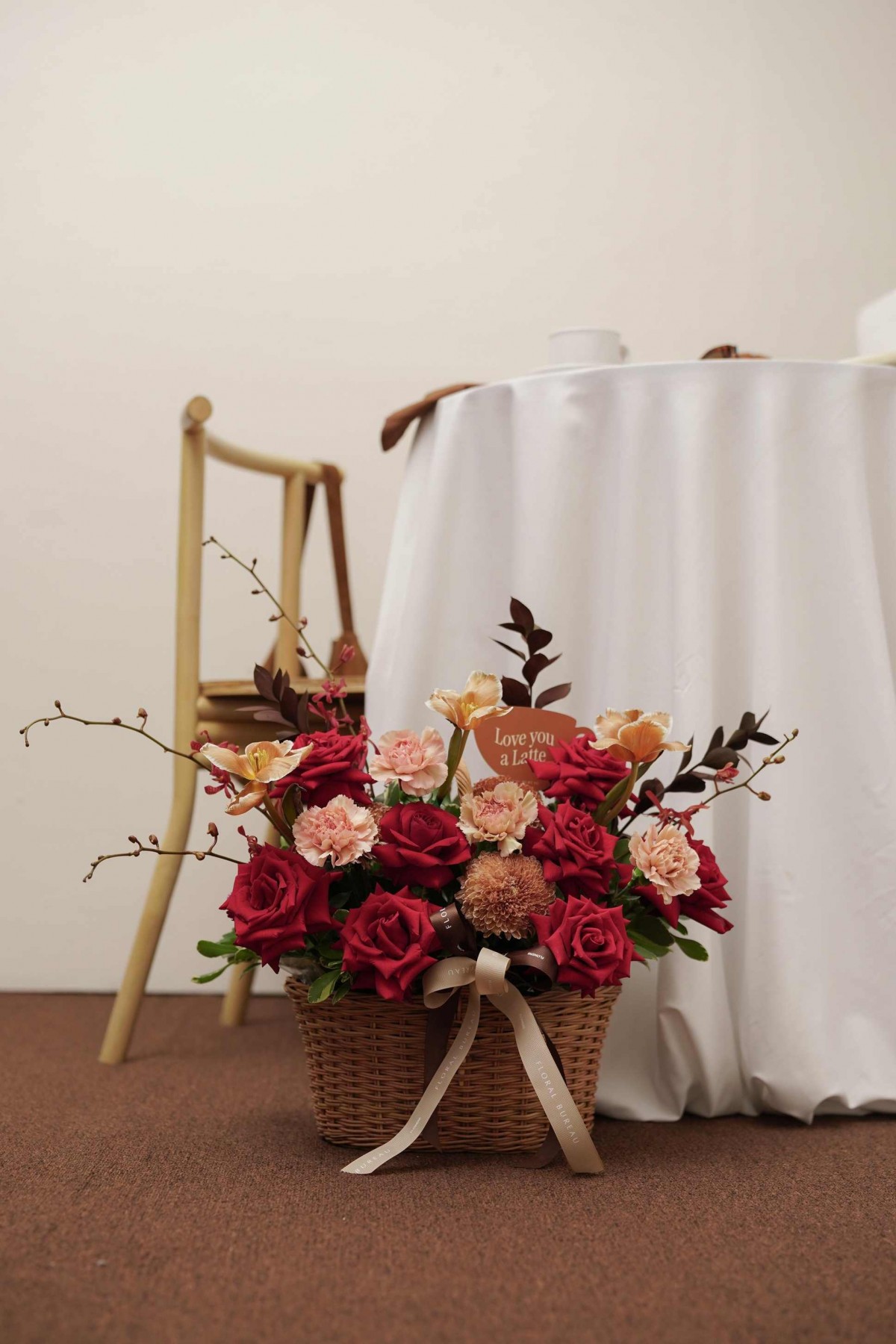 Red Brew draws inspiration from the depth of a strong espresso — bold, warm, and unmistakably romantic. Set in a woven basket, deep red roses are balanced with caramel and blush accents, creating a composition that feels rich and indulgent. Designed to sit beautifully on a table or counter, this arrangement evokes unhurried conversations, shared glances, and the comfort of something familiar yet deeply romantic and exciting.