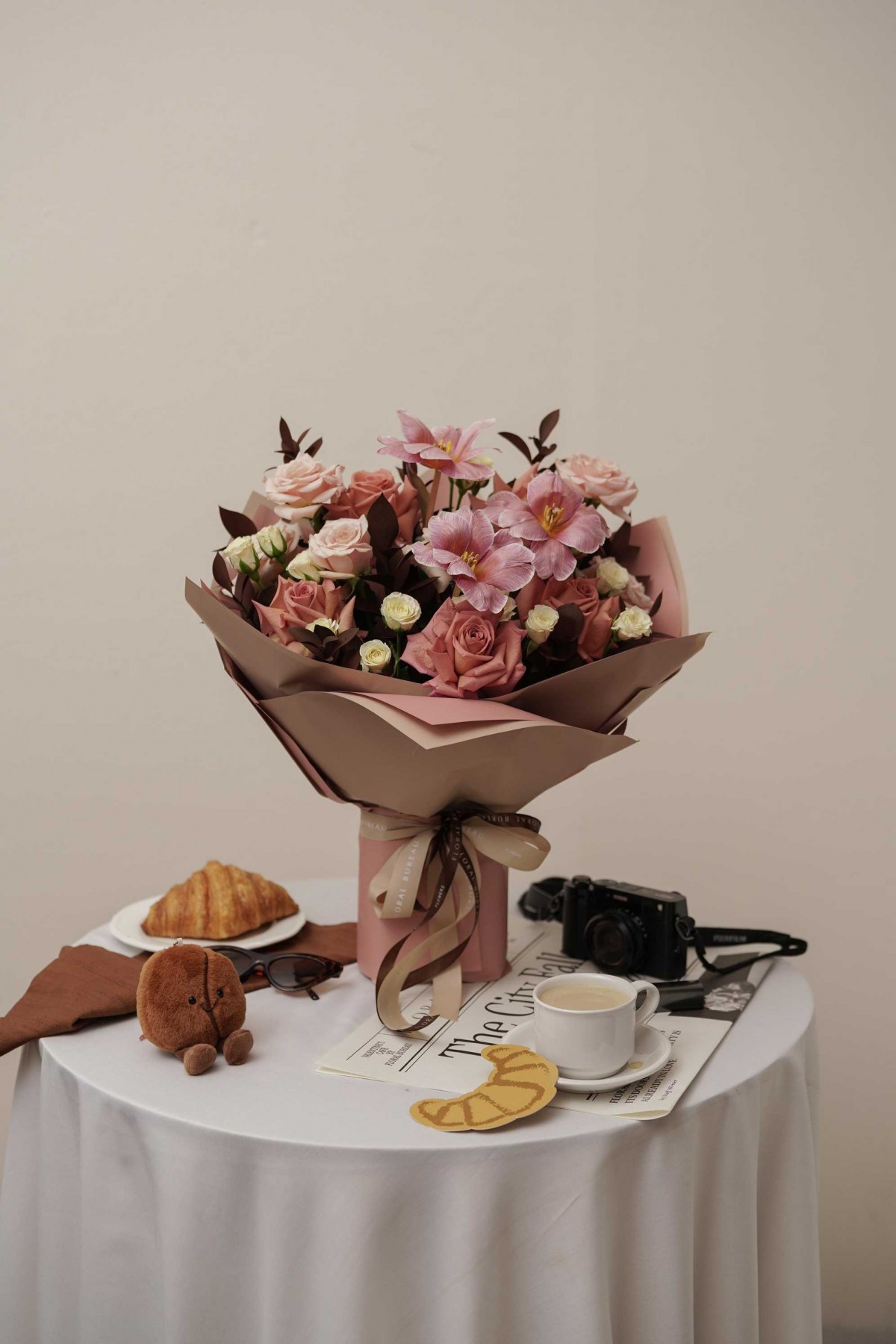 Light, warm, and effortlessly romantic, Rose Cappuccino is inspired by shared desserts and quiet conversations across a café table. Wrapped in soft coffee-toned hues, this hand bouquet feels intimate and modern, designed to be held close — like a warm cup nestled between your hands. Its gentle palette and relaxed structure make it perfect for moments that feel personal, thoughtful, and quietly meaningful.